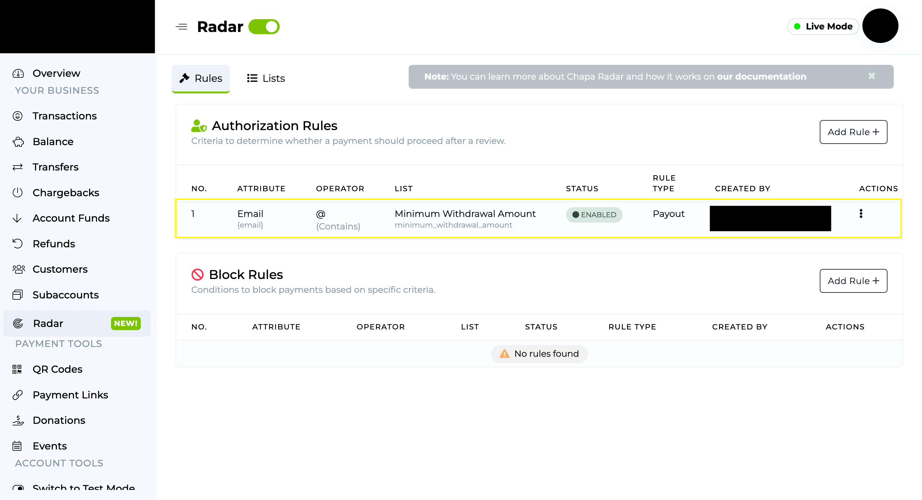 Head on to dashboard.chapa.co and Sign Up or Sign In. Click on the Radar from the side tab. If the toggle is not already on you can start the radar service by turning the toggle on